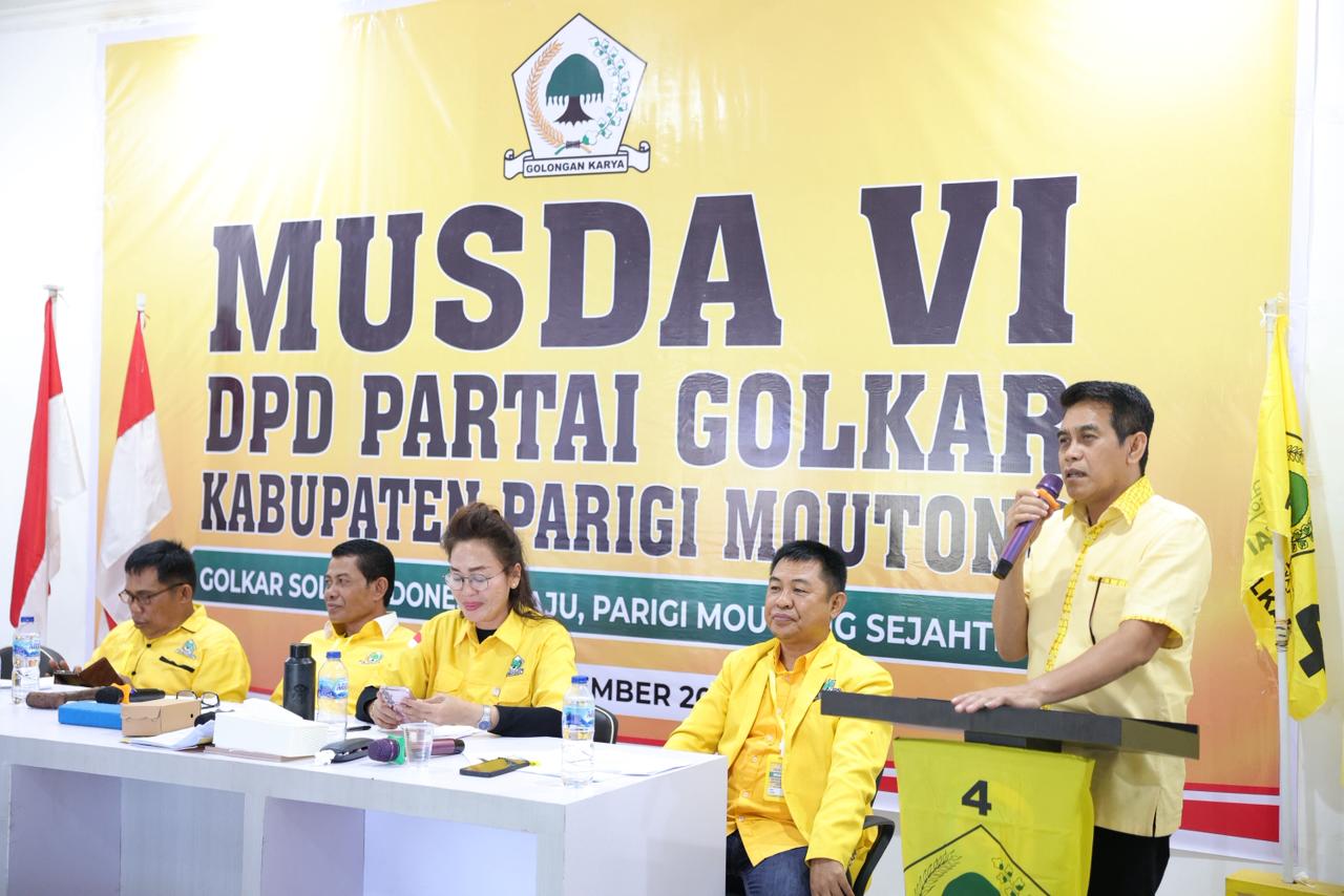 Parigi Moutong, Fokussulawesi.com – Ketua Dewan Pimpinan Daerah (DPD) Partai Golongan Karya (Golkar) Kabupaten Parigi Moutong yang baru terpilih, Erwin Burase, menargetkan perolehan 10 kursi DPRD pada Pemilihan Legislatif (Pileg) tahun 2029. Target ini disampaikan Erwin usai terpilih secara aklamasi pada Musyawarah Daerah (Musda) VI Partai Golkar Parigi Moutong yang digelar di Parigi, Jumat (19/12/2025).
