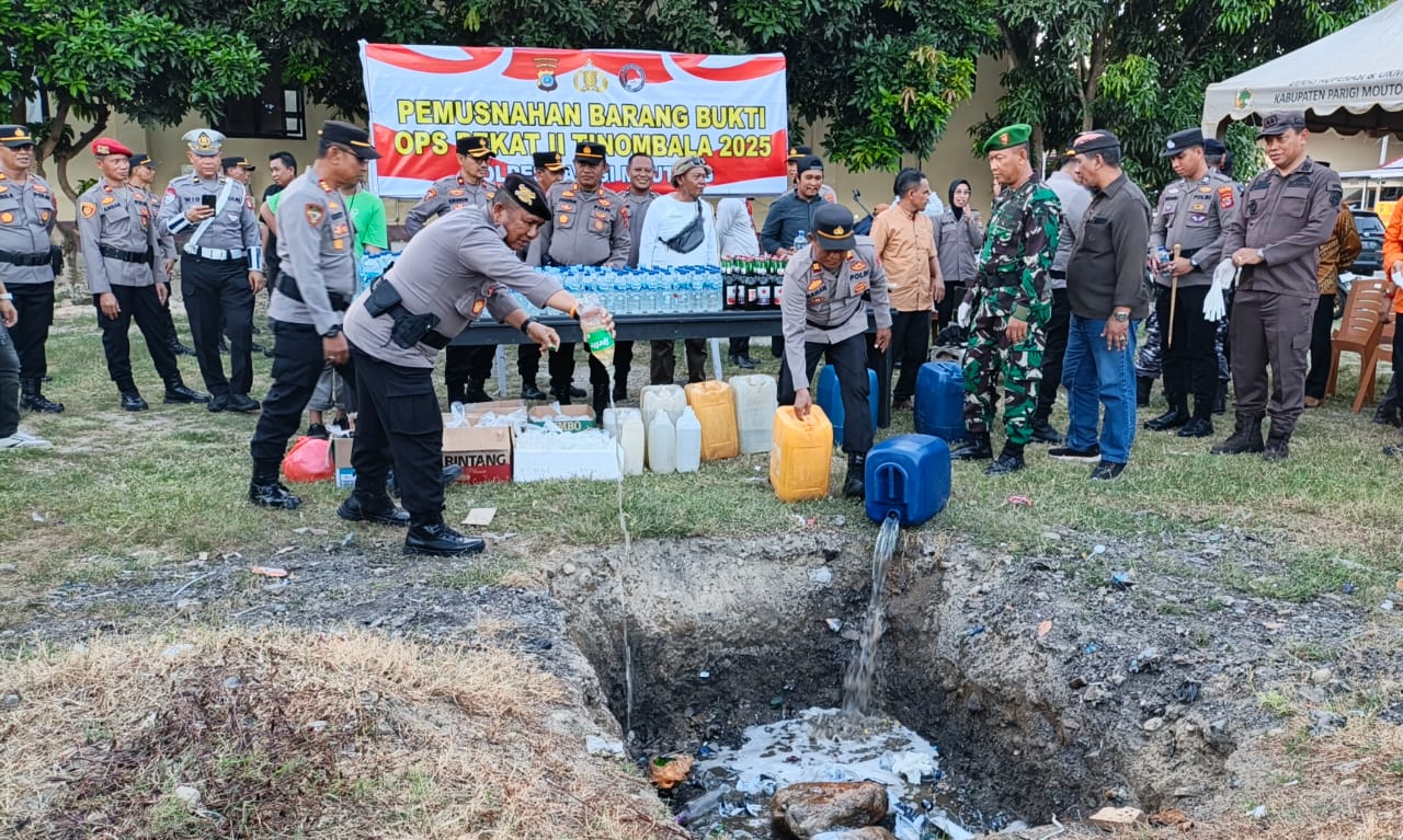 Adapun barang bukti yang dimusnahkan berupa 515 liter minuman keras (miras) jenis Cap Tikus yang dikemas dalam 150 botol ukuran sedang, 168 kantong plastik, 22 botol besar, serta puluhan jerigen dengan berbagai ukuran. Selain itu, turut dimusnahkan 52 botol miras jenis Bir Bintang, 5 botol Angker, 17 botol Benteng, dan 4 botol Marten.