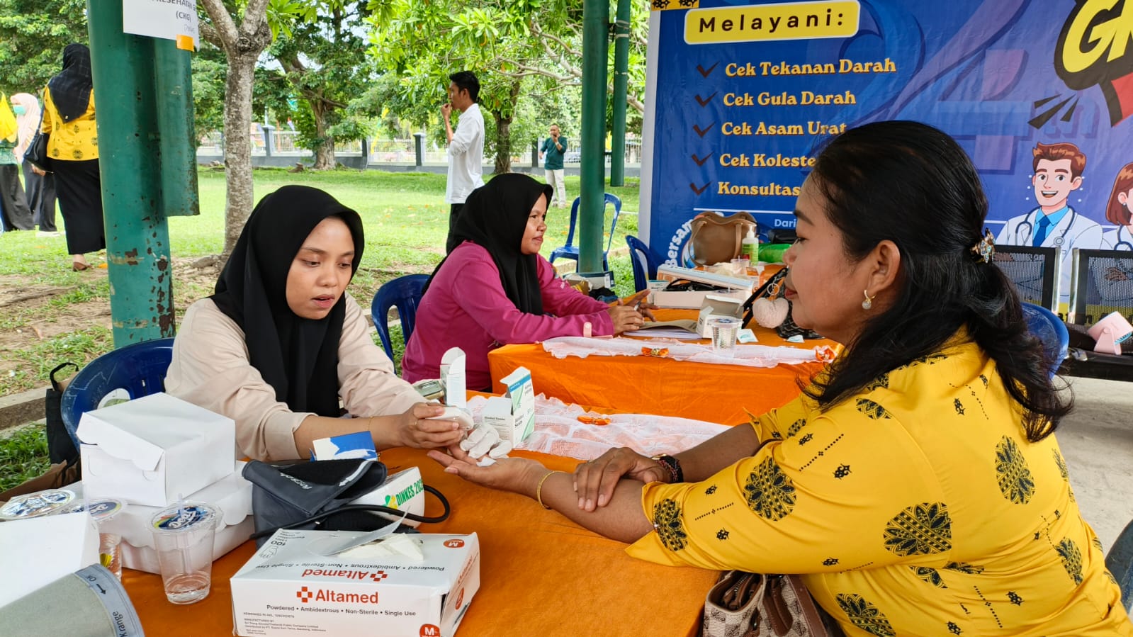 Layanan cek kesehatan gratis tersebut meliputi pemeriksaan tekanan darah, gula darah, asam urat, kolesterol, serta konsultasi kesehatan.